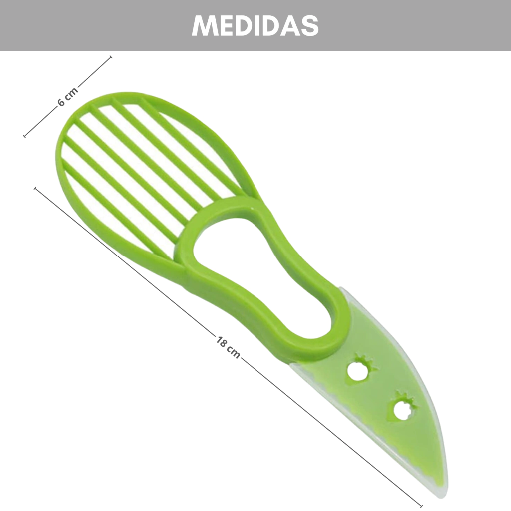 Cuenta con un cuchillo integrado que facilita el cortar la palta por la mitad, y un rebanador que permite cortar la pulpa en tiras uniformes con un solo movimiento, ideal para ensaladas, tostadas y guacamole.