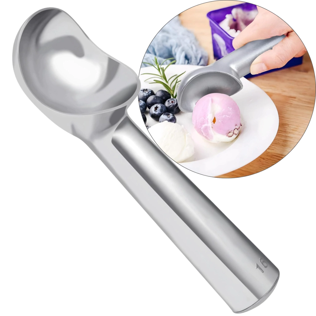 La superficie lisa y pulida facilita el deslizamiento en el helado, evitando que se pegue. Su ligereza facilita su manejo, y el diseño ergonómico proporciona un agarre cómodo y seguro, permitiendo servir helado sin esfuerzo.
