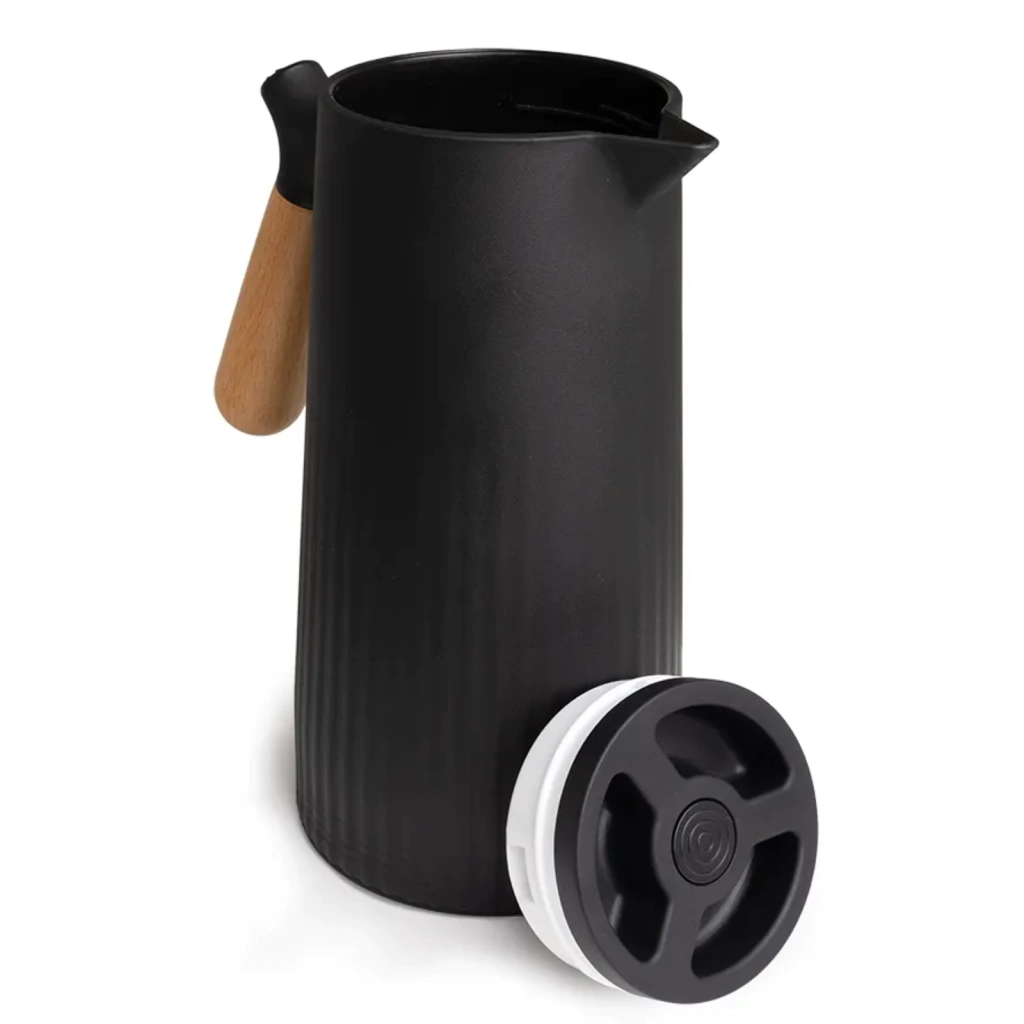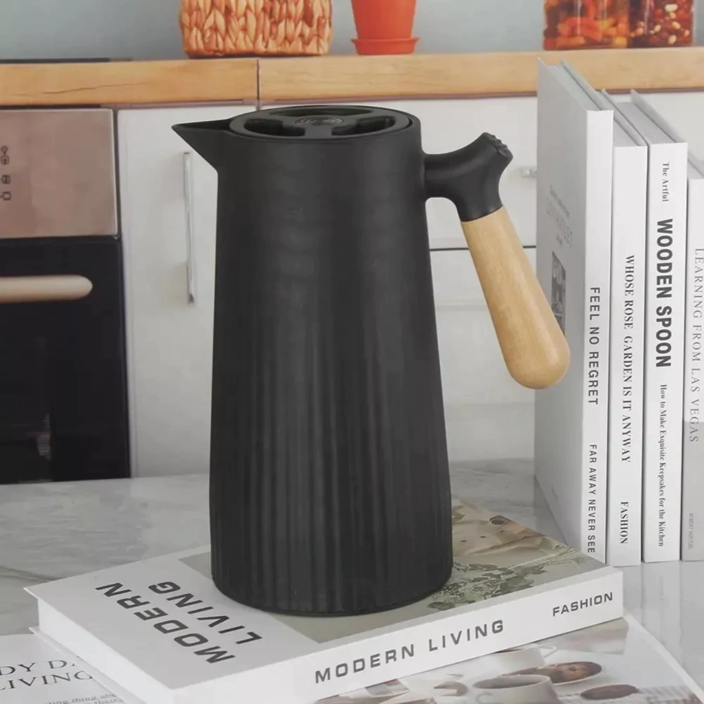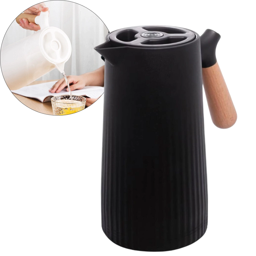 Esta jarra térmica es una opción perfecta para quienes buscan un diseño elegante y eficiente para mantener sus bebidas a la temperatura ideal, combinando materiales modernos y naturales.