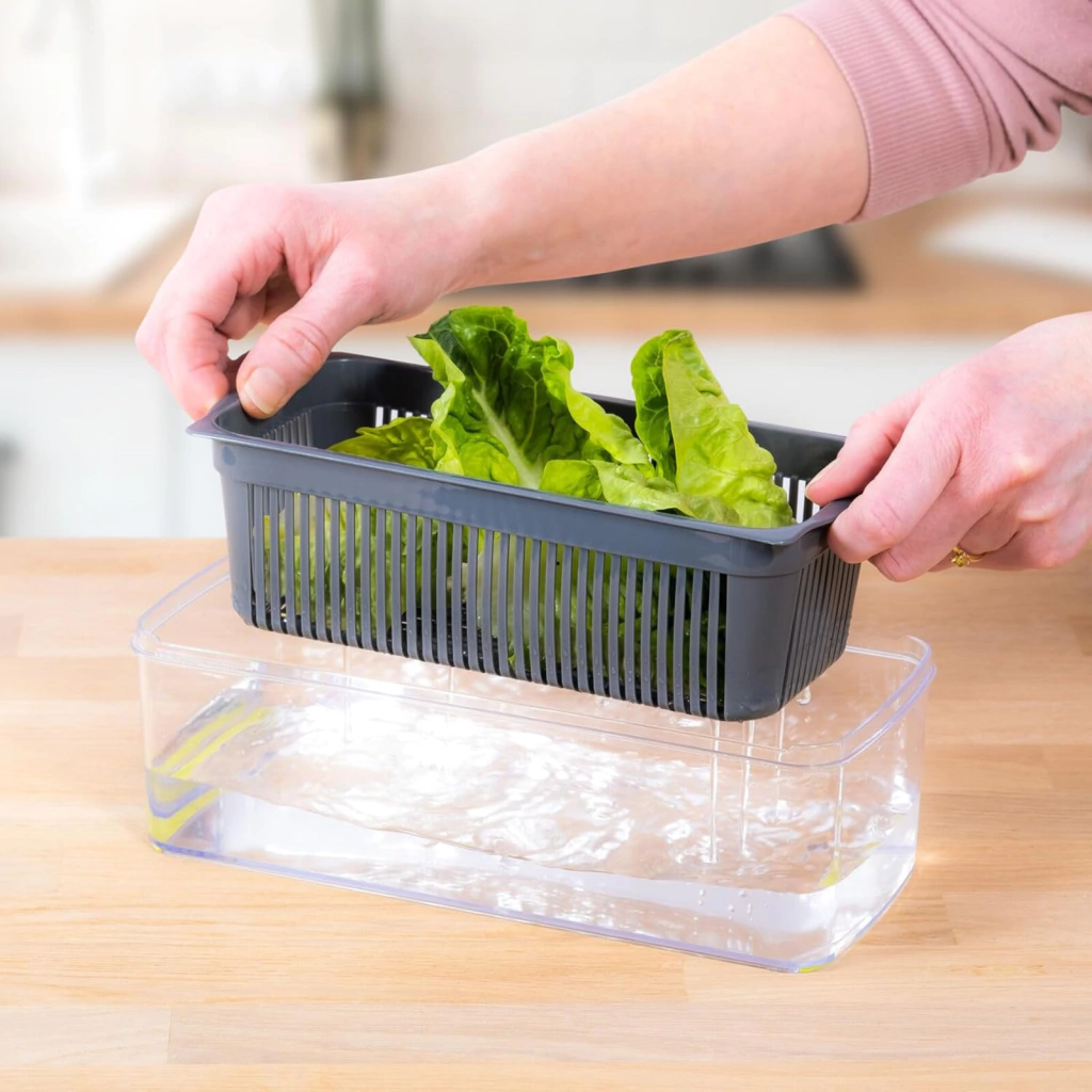 Viene con un recipiente transparente que se ajusta a la base, lo que permite que los alimentos caigan directamente en el recipiente sin desorden en la cocina. Además incluye un escurridor que se ajusta al recipiente para facilitar el lavado de los vegetales.