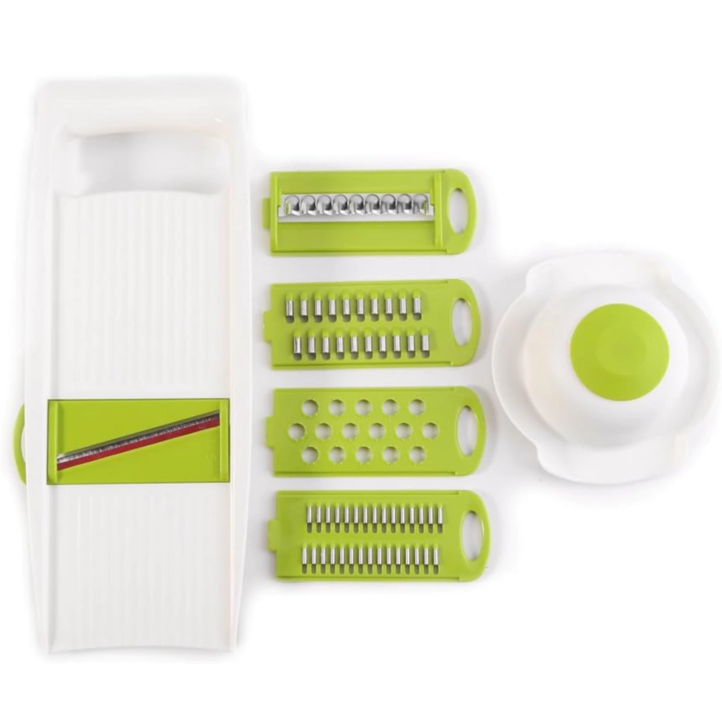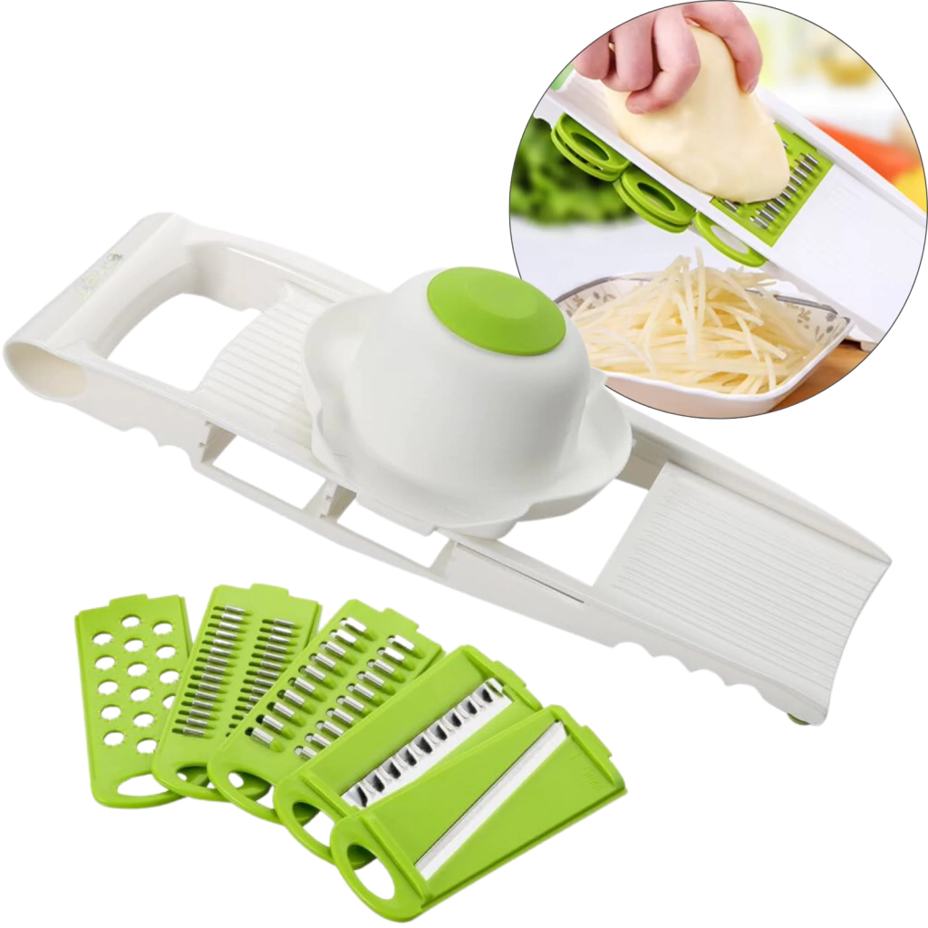 Esta mandolina 5 en 1 es perfecta para ahorrar tiempo en la preparación de alimentos y obtener cortes uniformes de manera rápida y segura, haciendo que cocinar sea más fácil y eficiente.