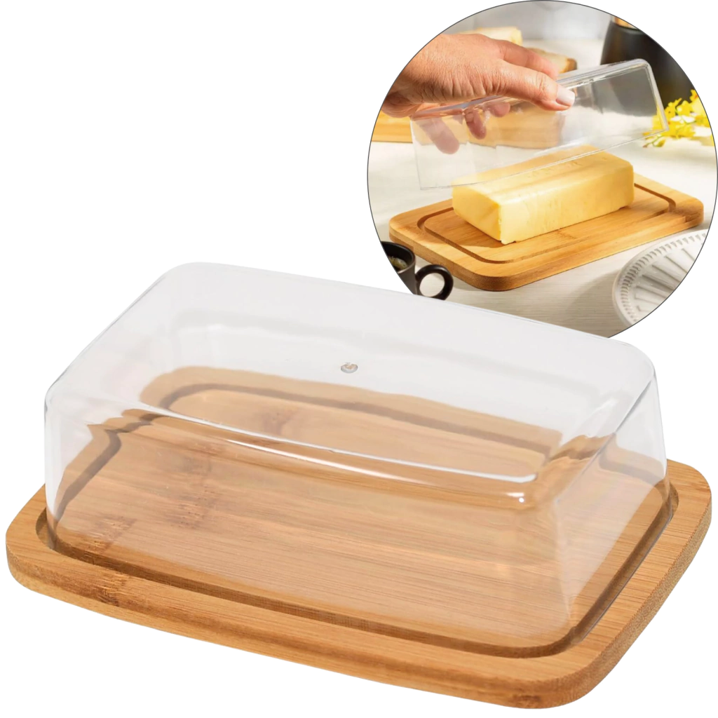 Hecha de acrílico y bamboo, esta mantequera es liviana y resistente a los golpes, garantizando una mayor vida útil y facilidad de manejo en la cocina.