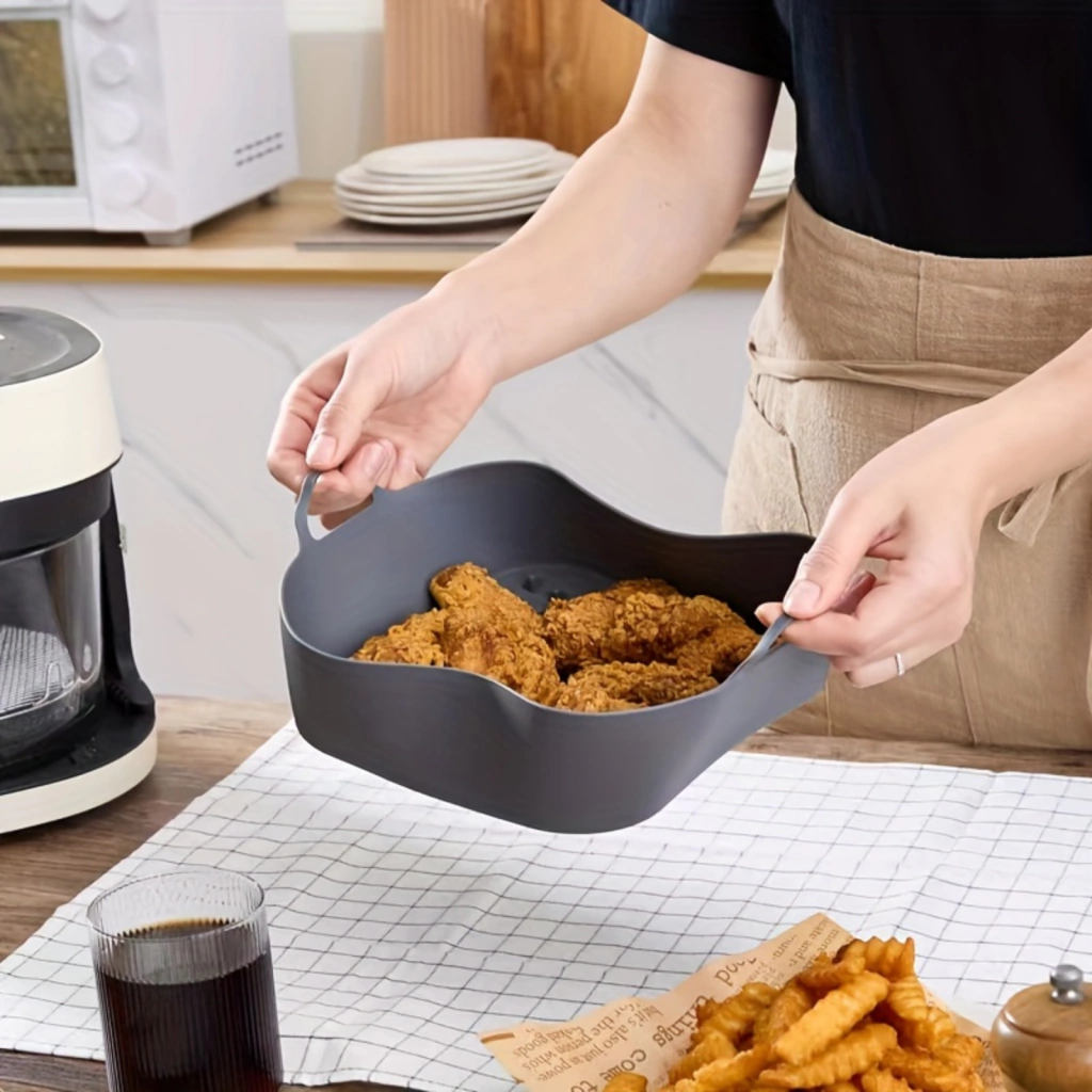 Este molde cuadrado de silicona está diseñado específicamente para su uso en freidoras de aire, proporcionando una forma práctica y segura de cocinar una variedad de alimentos sin que se peguen.