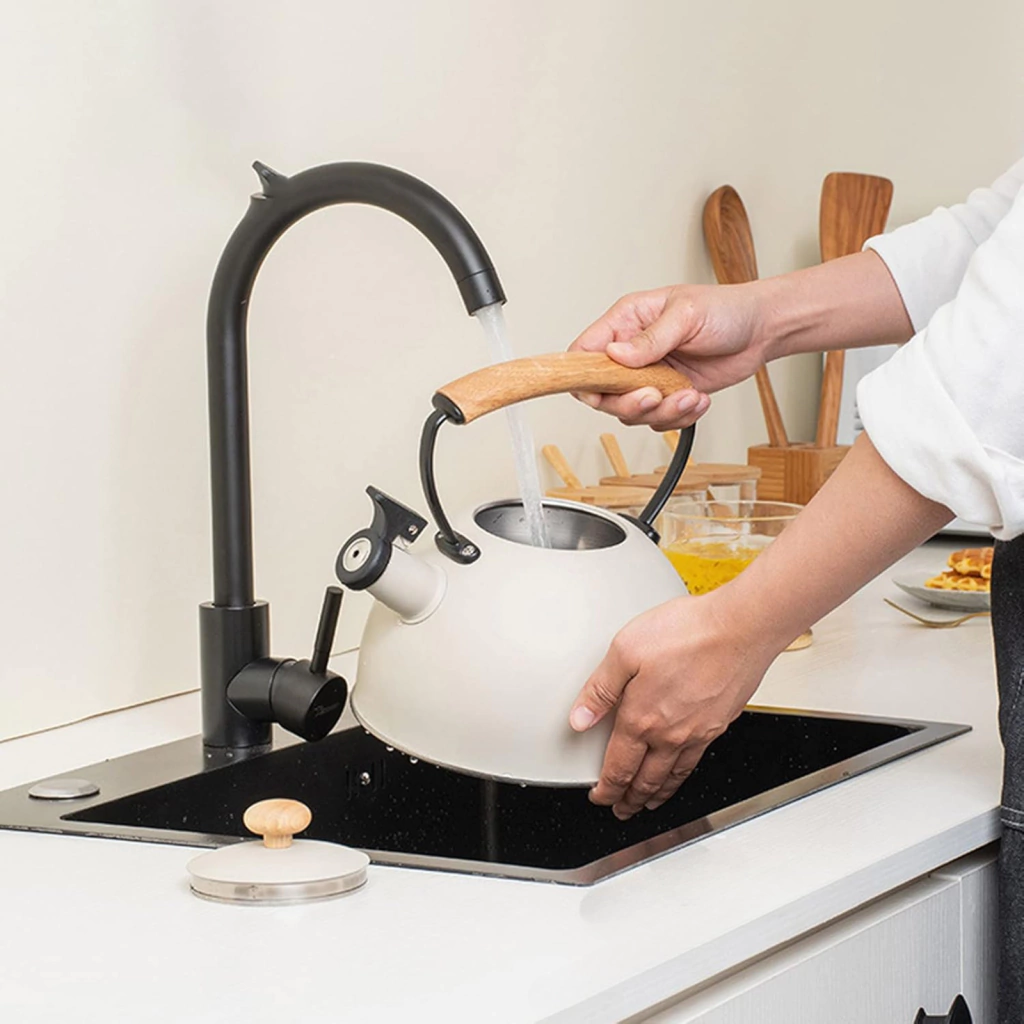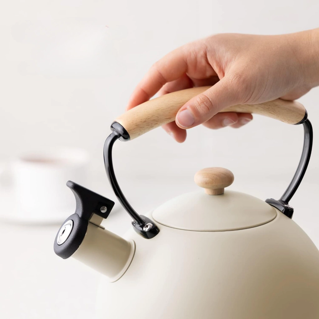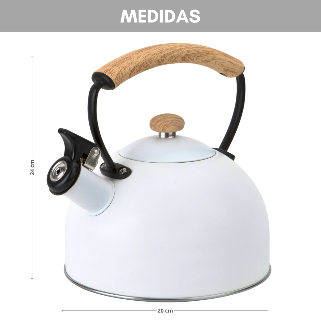 El diseño incluye un silbato que avisa cuando el agua alcanza el punto de ebullición, evitando el riesgo de sobrecalentamiento. Su diseño es práctico y funcional, perfecto para el uso diario.
