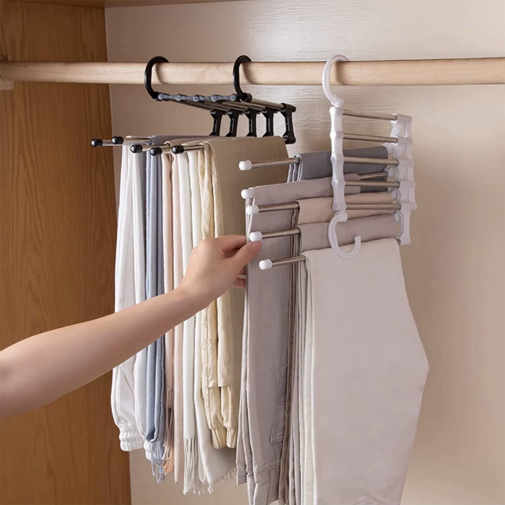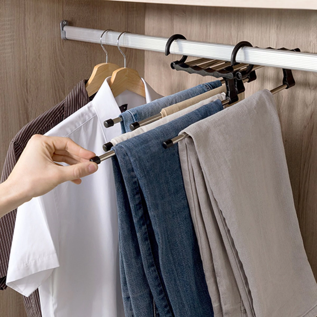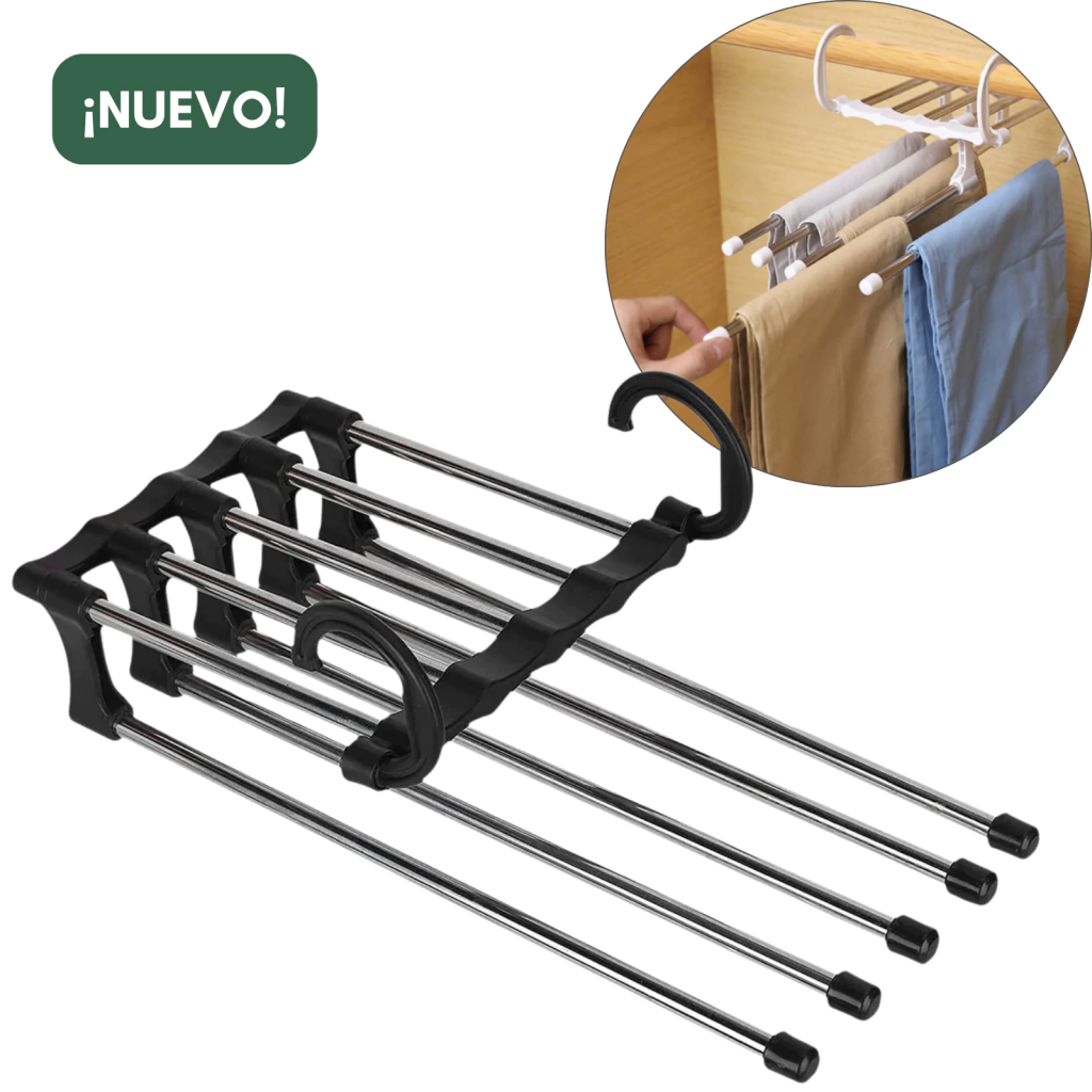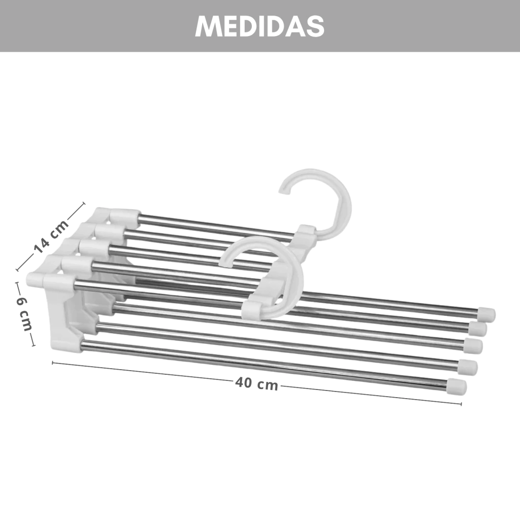 Cuenta con 5 varillas extensibles que permiten tener los pantalones al alcance y evita el amontonamiento de prendas.