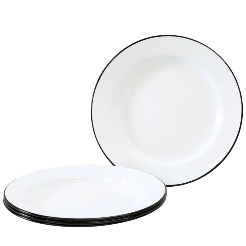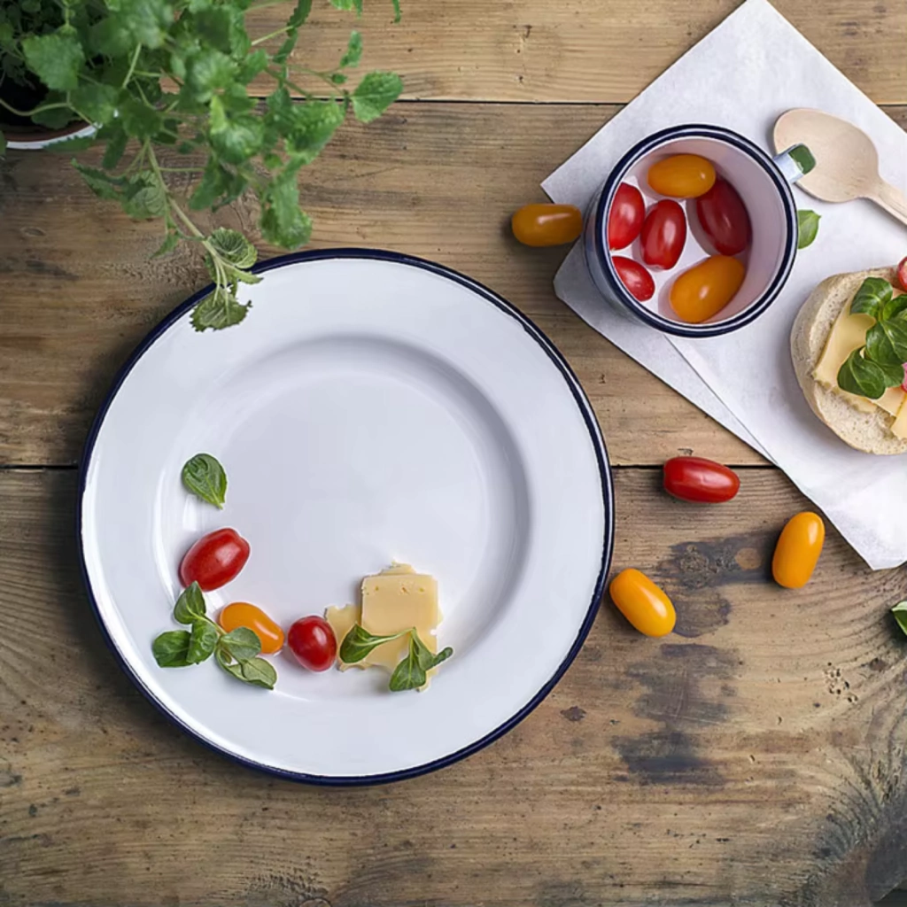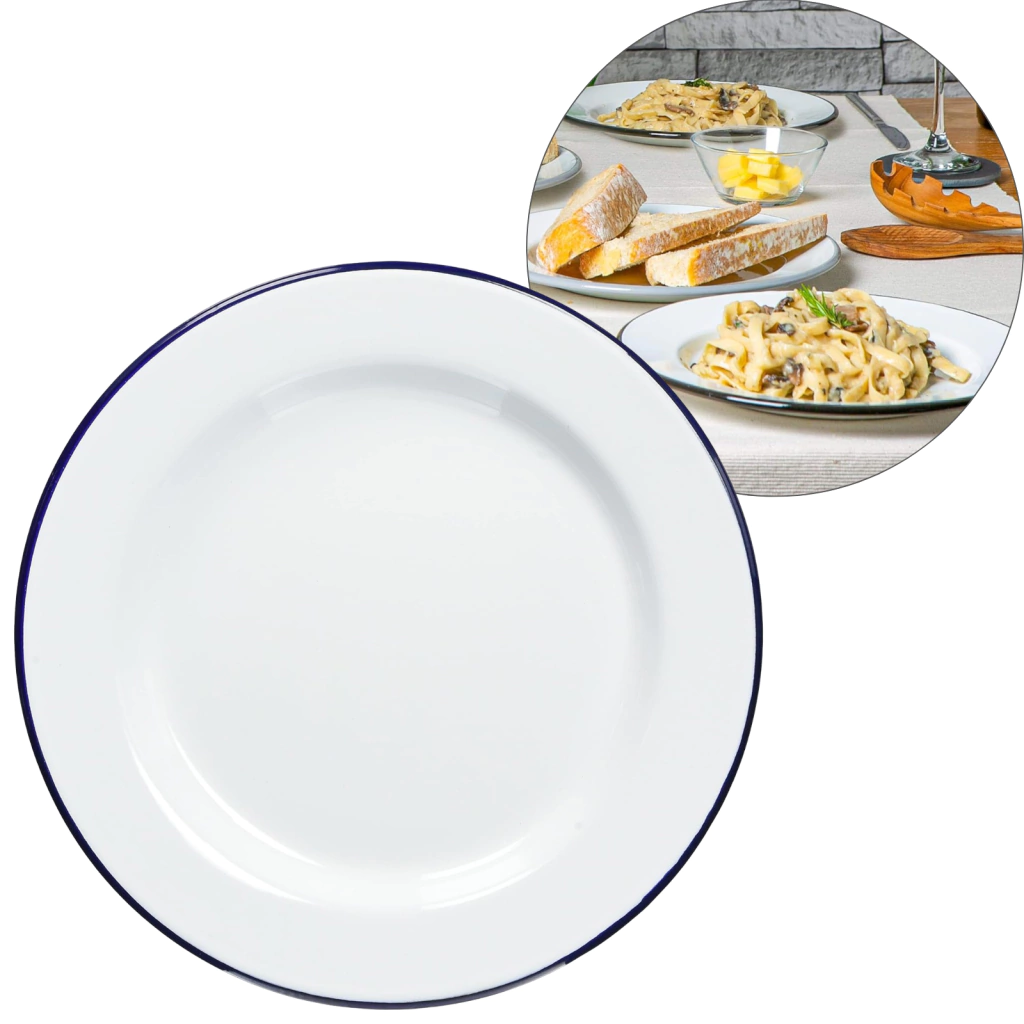 Este plato combina un esmalte blanco de alta calidad con un borde negro, creando un estilo vintage que se adapta a cualquier ocasión, desde comidas familiares hasta cenas elegantes.