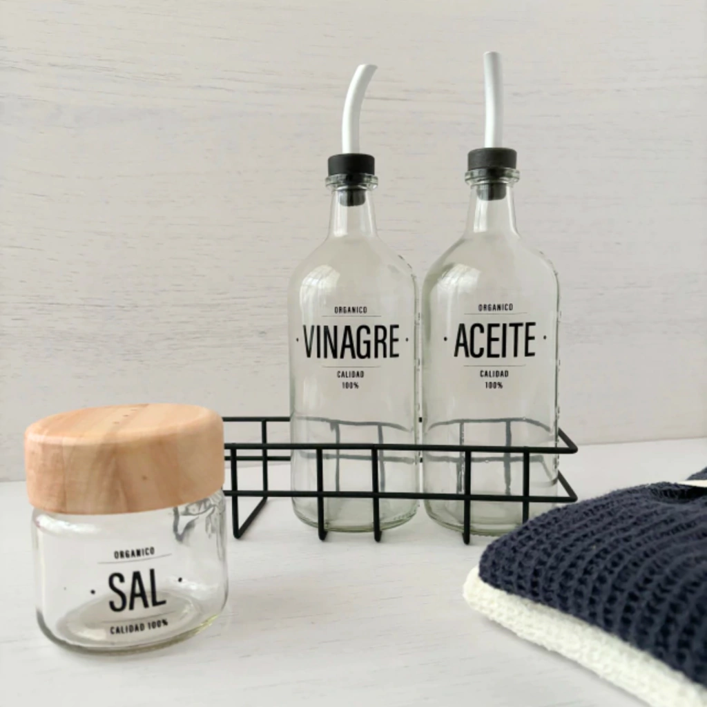 Tanto la aceitera, vinagrera como el salero están hechos de vidrio de alta calidad, lo que permite ver el contenido y controlar fácilmente las cantidades. Su acabado transparente se complementa con inscripciones en negro, dando un toque estético y clásico.
