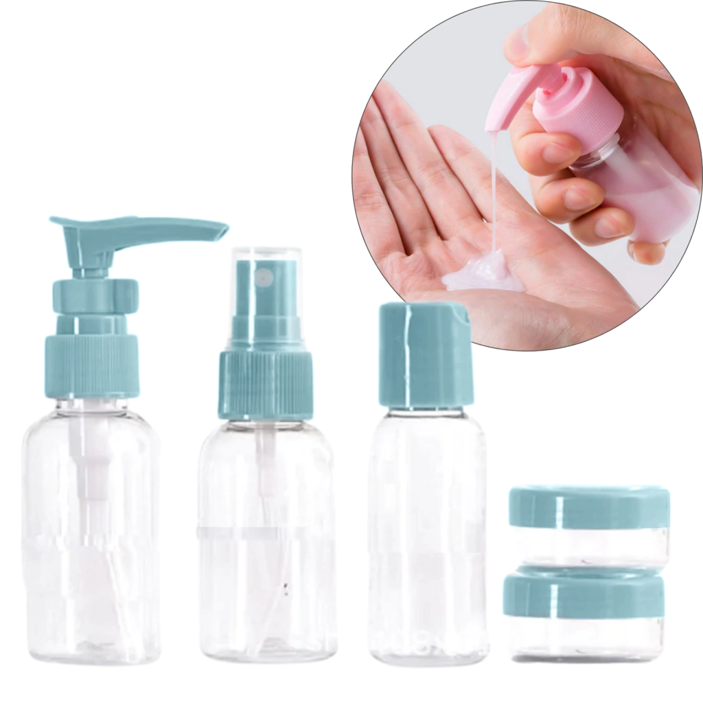 El set incluye 5 potes con diferentes picos y tapas, permitiéndote llevar diferentes productos como shampoo, acondicionador, gel de ducha, loción, cremas y más, manteniéndolos separados y organizados.